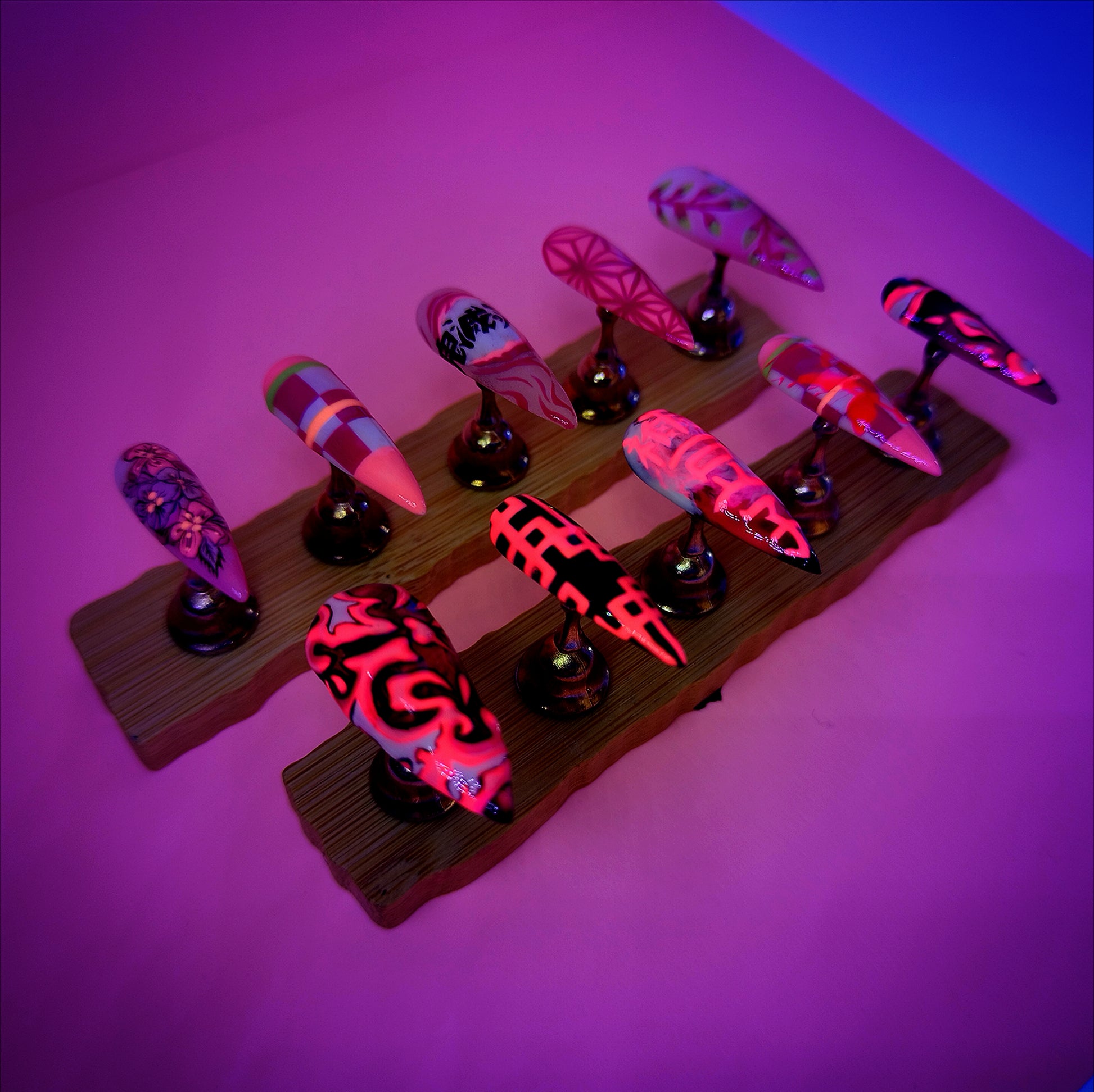 Bring bold anime flair to your look with these bright neon press-on nails inspired by Nezuko from Demon Slayer. Featuring vibrant colors that capture her fierce spirit, these nails make a daring statement while offering easy, damage-free application. Perfect for fans ready to stand out and channel their favorite character’s energy.