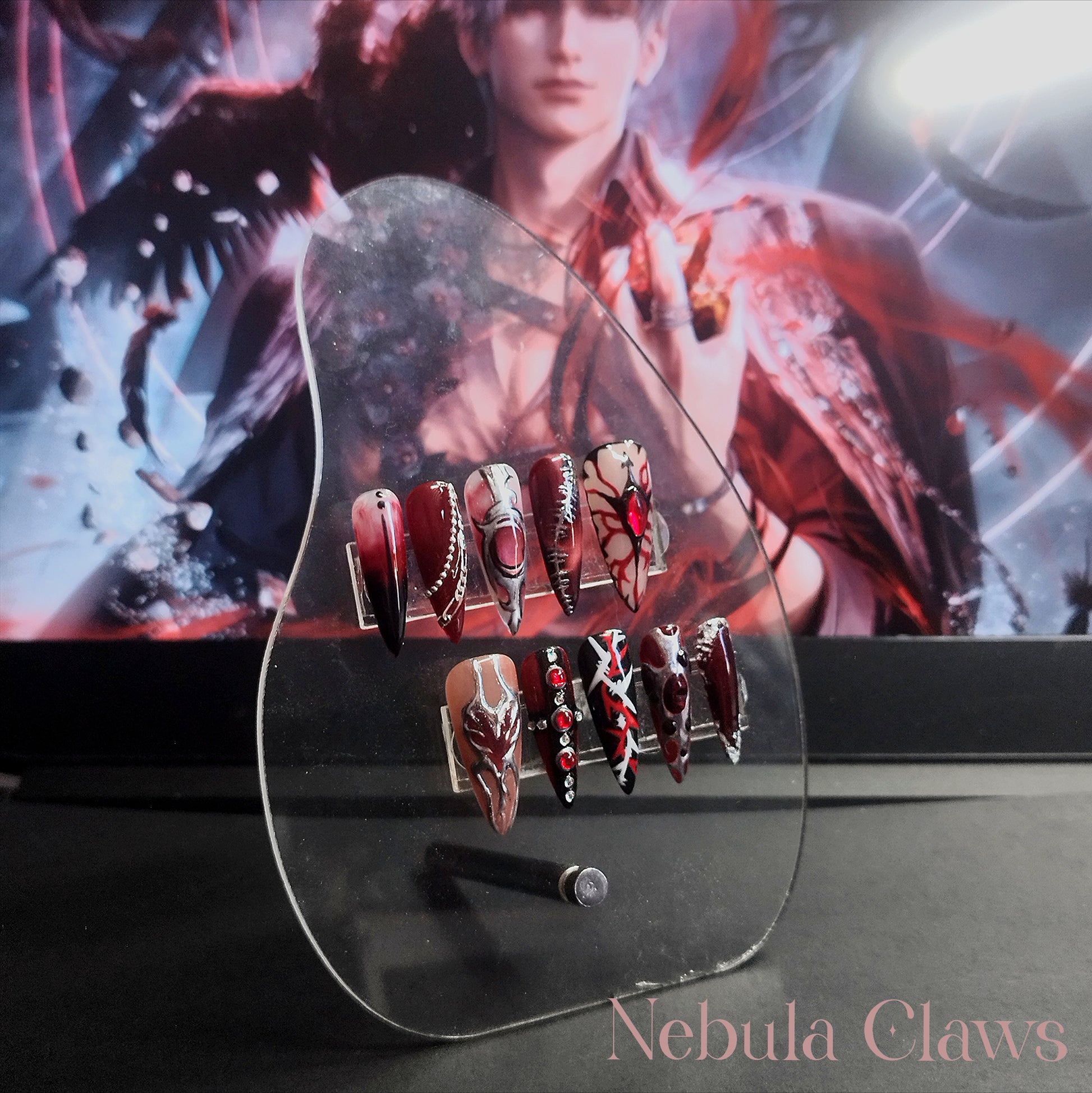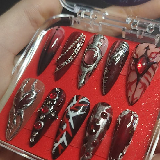 Step into the shadows with these daring Sylus - inspired press-on nails, crafted to evoke the intense and mysterious vibe of Love and Deepspace. Bold, dark tones and edgy design details make each nail a statement piece, perfect for those who want to showcase their fearless style effortlessly. Transform your look with a striking touch of otherworldly allure.