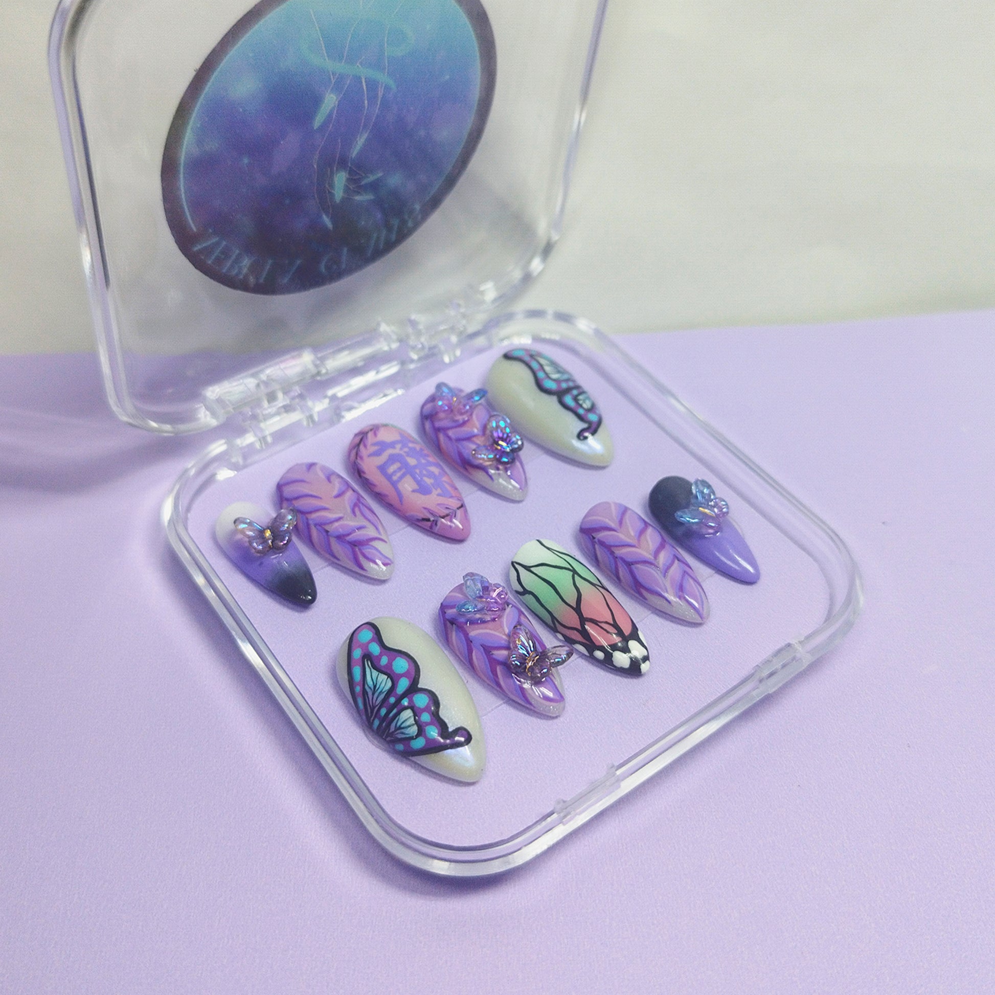 Embrace the mystique of Shinobu with these soft pastel press-on nails, capturing the delicate yet powerful spirit of the Insect Hashira. Perfect for daring fans, their magical hues bring an ethereal charm that commands attention while offering a bold, effortless way to showcase your anime passion.